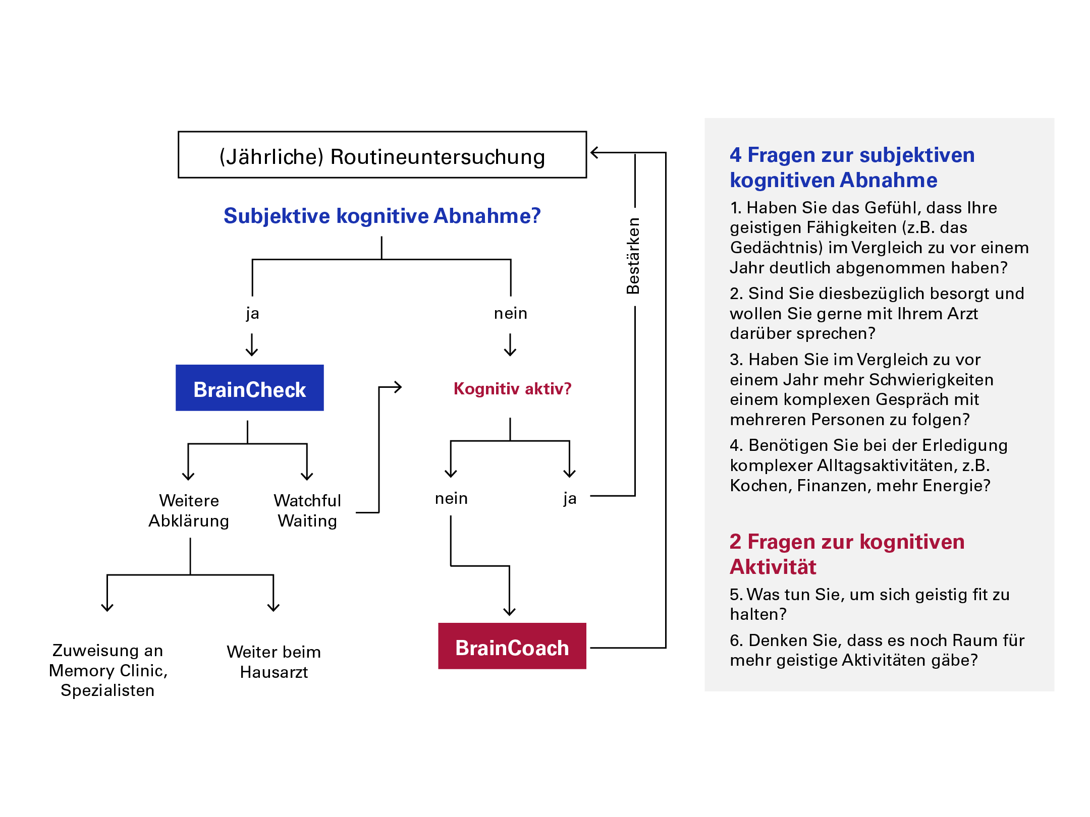 Gerne möchten wir Ihnen anhand des folgenden Algorithmus vorschlagen, bei welchen Ihrer Patienten das BrainCoach-Programm angewendet werden könnte. Der Algorithmus besteht aus 6 kurzen Fragen zur Einschätzung der geistigen Aktivität und der subjektiven kognitiven Leistungsfähigkeit des Patienten.